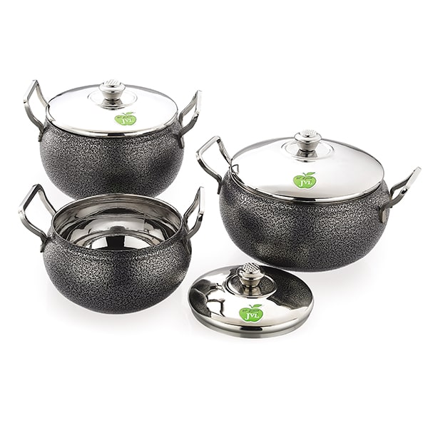 JVL Flame Pot Powder Coated Stainless Steel Cooking Sauce Pot Handi Vessel with Lid – 3 Pcs Set