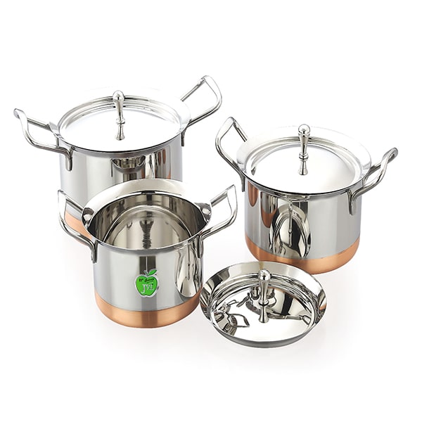- JVL Normal Pot Copper Bottom Stainless Steel Cooking Sauce Pot Handi Vessel with Lid – 3 Piece Set