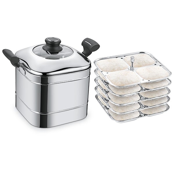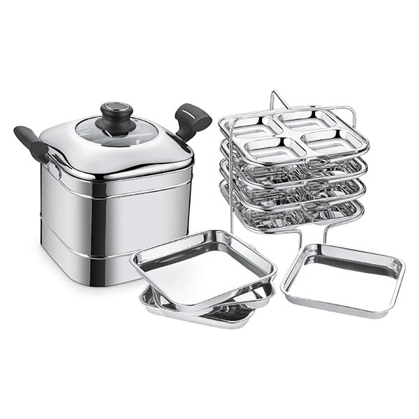 - Features square – shaped idly & dhokla plates for a modern touch